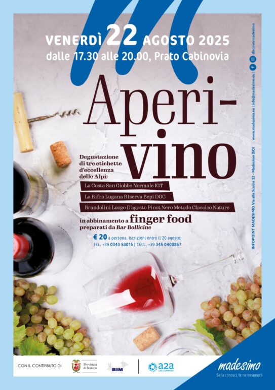 Siamo lieti di invitarvi all'evento Aperivino, un'esperienza unica di degustazione e convivialità nel cuore di Madesimo. Unisciti a noi per un aperitivo indimenticabile che avrà luogo presso il prato della Cabinovia Larici.