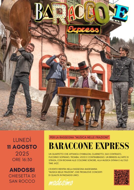 Per la rassegna "Musica nelle Frazioni", sull'altopiano degli Andossi, vicino alla chiesetta di San Rocco, in data lunedì 11 agosto si esibiranno i Baraccone Express, un quartetto che al cymbalom affianca il clarinetto, il sax contralto, flicorno soprano e tromba, voce e contrabbasso per un mix musicale di grande impatto. Un brindisi all’arte di strada, alla musica dei viandanti e delle carovane, che unisce richiami alle colonne sonore (da Nino Rota agli Spaghetti Western), melodie gitane e la tradizione dell’Old Time Jazz.