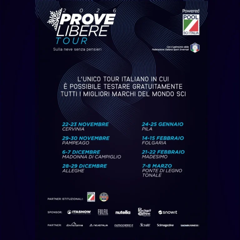 Il Pool Sci Italia, Consorzio fornitore ufficiale delle Squadre Nazionali di Sci Alpino, annuncia il calendario ufficiale del Prove Libere Tour 2026. Otto tappe, da novembre a marzo, per vivere lo ski test gratuito più importante e coinvolgente d’Italia, proprio nell’anno dei Giochi Olimpici Invernali Milano Cortina 2026. Un viaggio tra neve, passione e condivisione, per provare le ultime novità tecniche delle aziende leader del settore, con lo stesso spirito di eccellenza che anima gli Azzurri in pista.